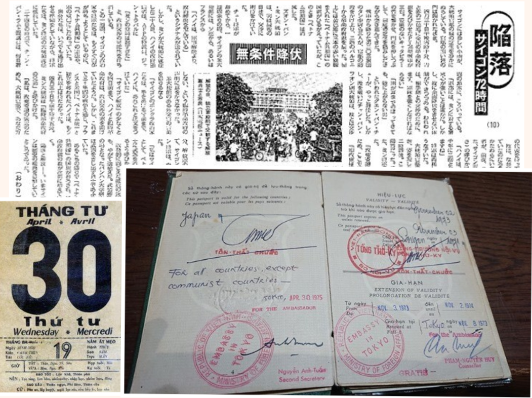 30/4/75 tôi đang ở nhà cùng với 2 người bạn, khi thấy TV chạy hàng chữ tốc báo: “サイゴン政府無条件降伏 “Sài gòn đầu hàng vô điều kiện”. Dù biết là chuyện sẽ đến khi nghe tin dữ từ quê nhà suốt cả tháng 4, nhưng cũng bàng hoàng khi biết chắc chắn 100% “Saigon đã rơi vào tay Bắc Quân”. Chỉ trao qua đổi lại với 2 ông bạn cùng phòng vài câu ngắn ngủi, tôi vẫn phải sách cặp đến trường, vì hôm đó bắt buộc phải có mặt vào giờ chuyên môn của một ông thầy khó tính, chỉ 3 lần vắng mặt là coi như rớt môn đó, sang năm phải lấy lại mà tôi đã vắng mặt 2 lần.