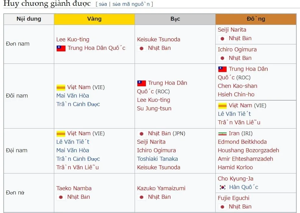 Việt Nam Cộng Hòa và Bảng sắp hạng bóng bàn trong Á Vận Hội năm 1958