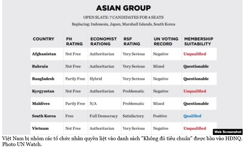 Một liên minh các nhóm nhân quyền phi chính phủ từ châu Âu, Hoa Kỳ và Canada vừa đồng thanh kêu gọi các quốc gia thành viên Liên Hiệp Quốc bác tư cách ứng cử thành viên của Việt Nam và 4 nước khác vào Hội đồng Nhân quyền LHQ, cho rằng các nước này “không đủ tiêu chuẩn”.
