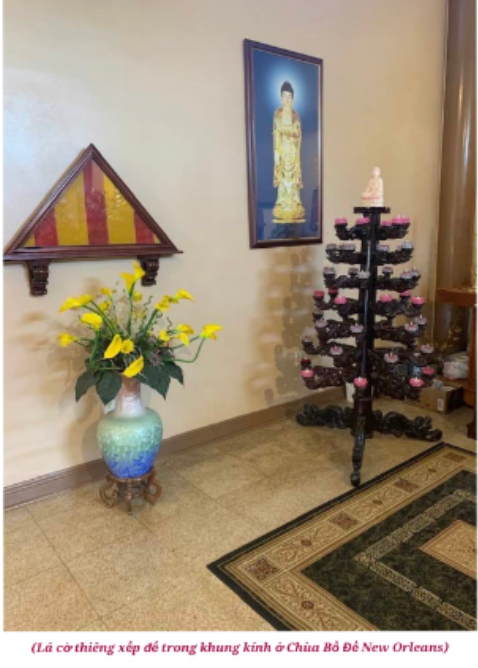 (Lá cờ thiêng xếp để trong khung kính ở Chùa Bồ Đề New Orleans)
