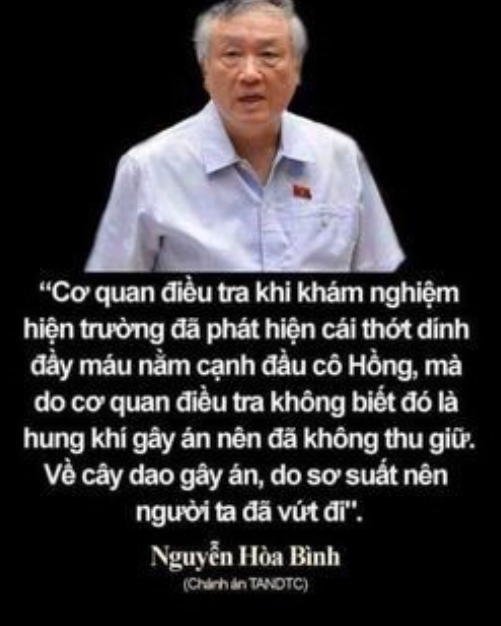Thế mà đây là vụ án hình sự, giết hai mạng người cùng một lúc với hành vi hết sức dã man. Tất cả đều phơi ra trước hiện trường, nhưng cán bộ điều tra lại vứt hết vật chứng: Cái thớt dính máu, chiếc ghế và con dao có liên quan đến việc gây án, kế cả các vết máu… các vật trên đều được gom lại và đều … vứt đi hết; đều nằm ngoài hồ sơ vụ án. Nhưng được ông Chánh án Tòa án tối cao biện minh: “Do sơ xuất của cán bộ điều tra vì không biết đó là vật gây án”. Trong án văn, Chánh án Tòa tối cao Nguyễn Hòa Bình lại nói: “Tuy có sai sót nhưng không làm thay đổi bản chất vụ án”. (Vì bản chất của vụ án là phải tìm cho bằng được một người nào đó để giết). Và ông thao thao bất tuyệt đọc như học sinh cấp 1 đọc bài học thuộc lòng trước Hội trường Quốc hội, về các lời khai được cho là của tử tù Hồ Duy Hải nhận tội giết hai cô gái ở Bưu điện Cầu Voi. Ông Nguyễn Hòa Bình cho đó là bằng chứng buộc tội. Và ông kết cho Hồ Duy Hải án tử hình.